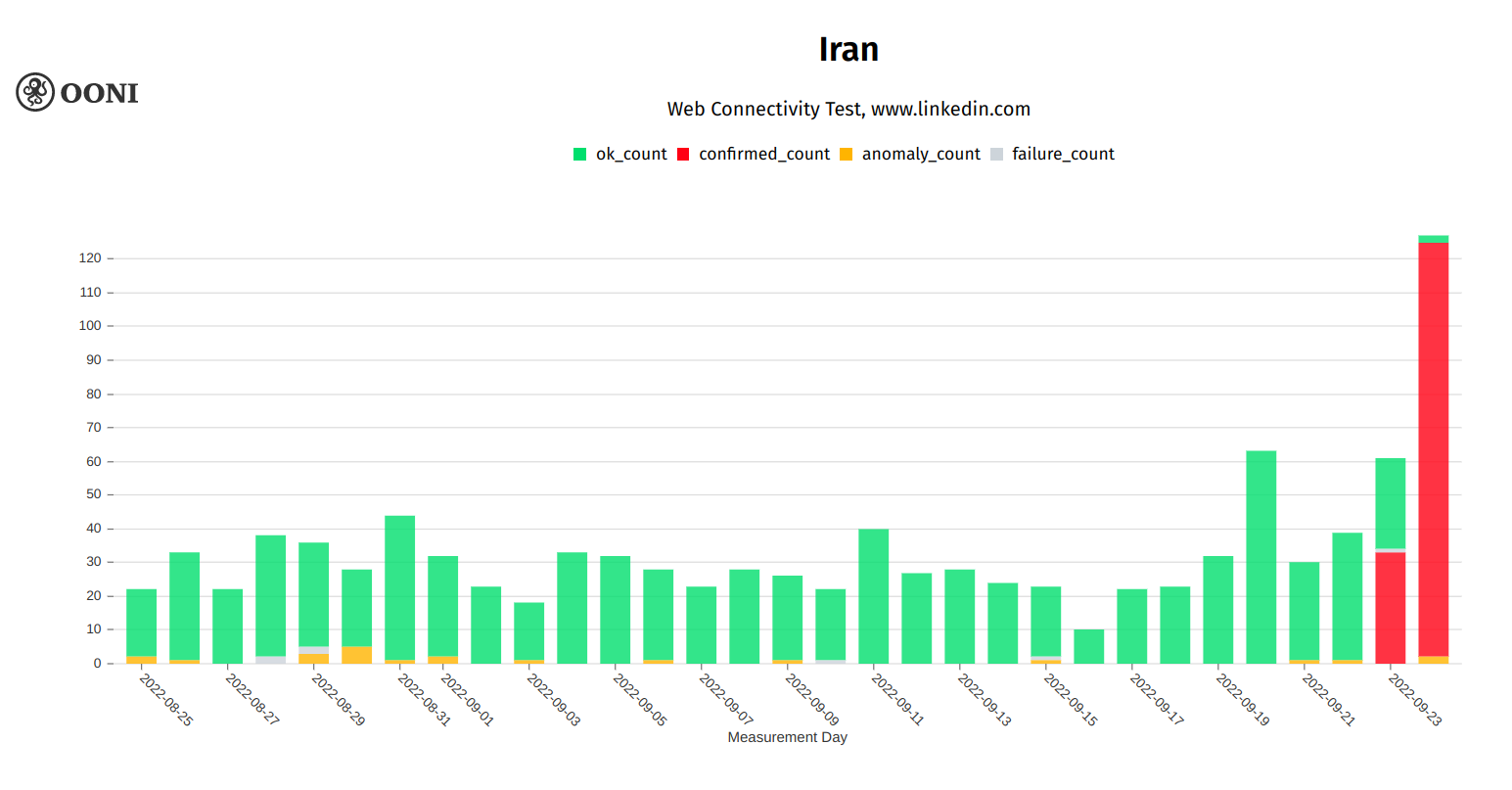 Chart: OONI data on the testing of www.linkedin.com on multiple networks in Iran between August 2022 to September 2022 (source: OONI MAT).