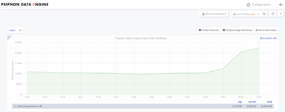 On 21st September 2022, the above chart (taken from the Psiphon Data Engine) shows a spike in the number of daily Psiphon users from Iran, indicating increased Psiphon adoption, which correlates with the blocking of WhatsApp and Instagram (which also began on 21st September 2022).