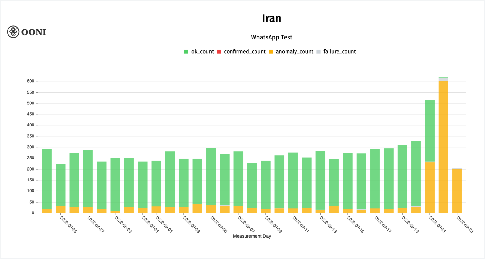 Chart: OONI data on the testing of WhatsApp endpoints in Iran between August 2022 to September 2022 (source: OONI MAT).
