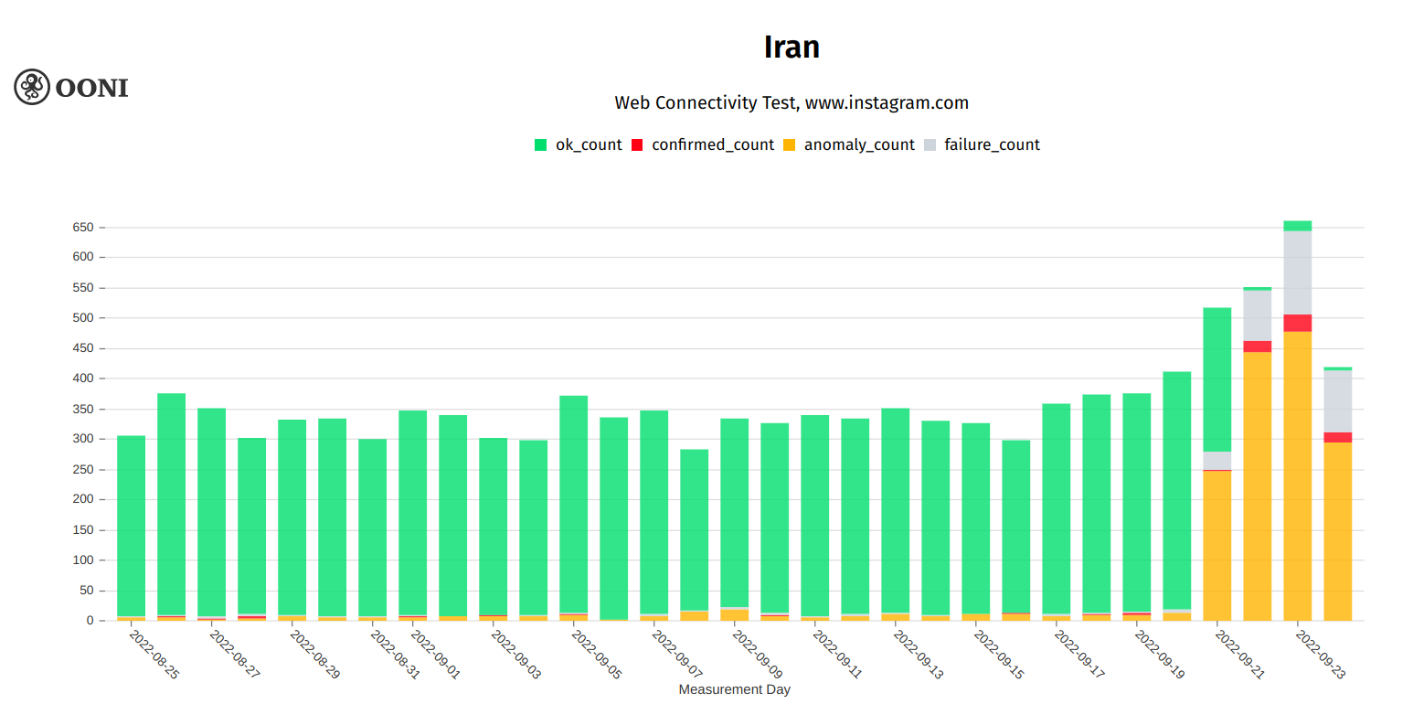 Many ISPs in Iran also started blocking Instagram on 21st September 2022. The following chart, which aggregates OONI measurement coverage from the testing of www.instagram.com on multiple networks in Iran, clearly shows a surge in anomalous measurements in recent days.