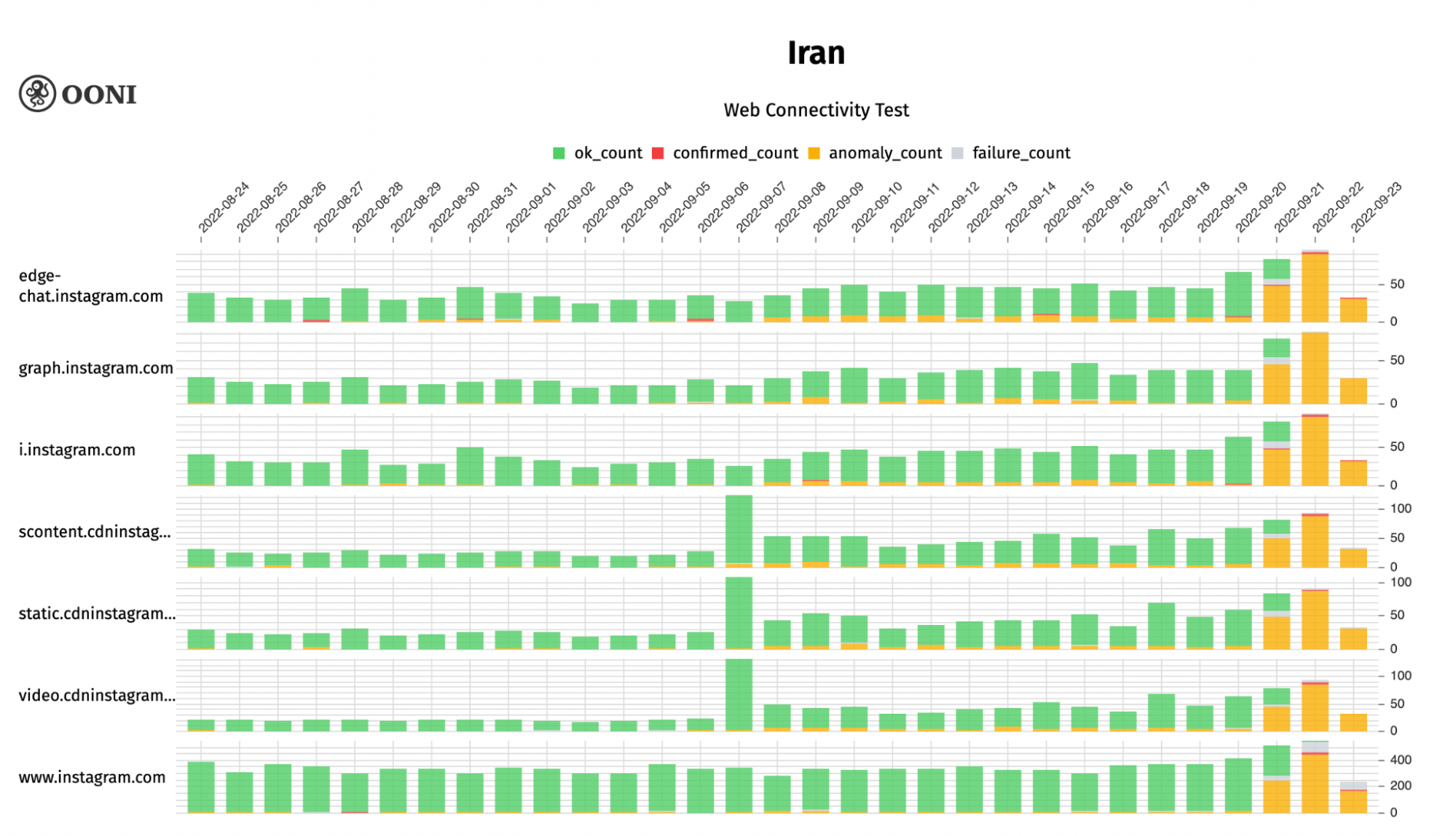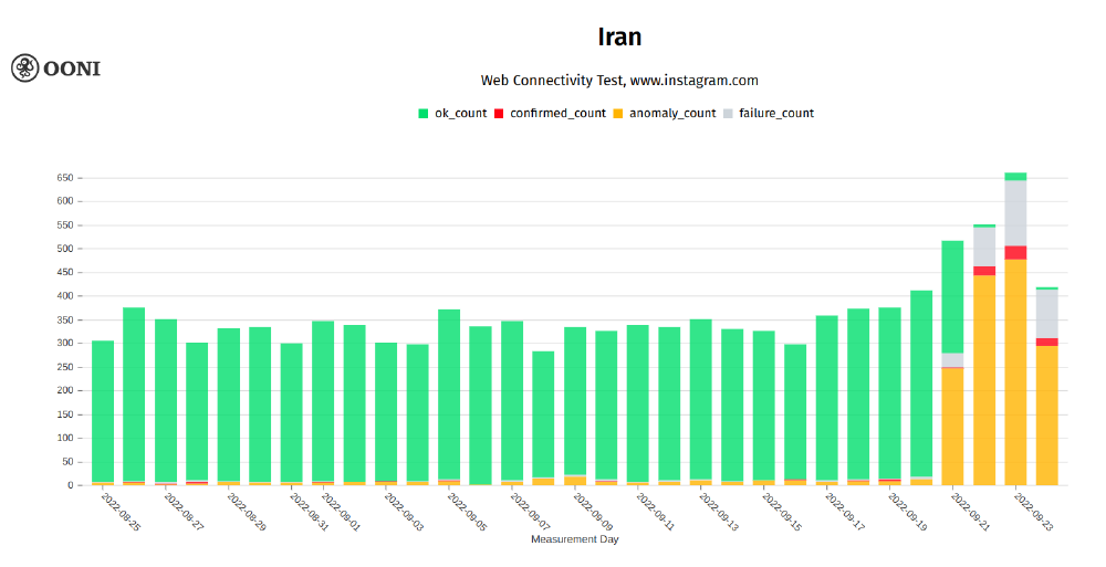 Chart: OONI data on the testing of Instagram domains in Iran between August 2022 to September 2022 (source: OONI MAT).