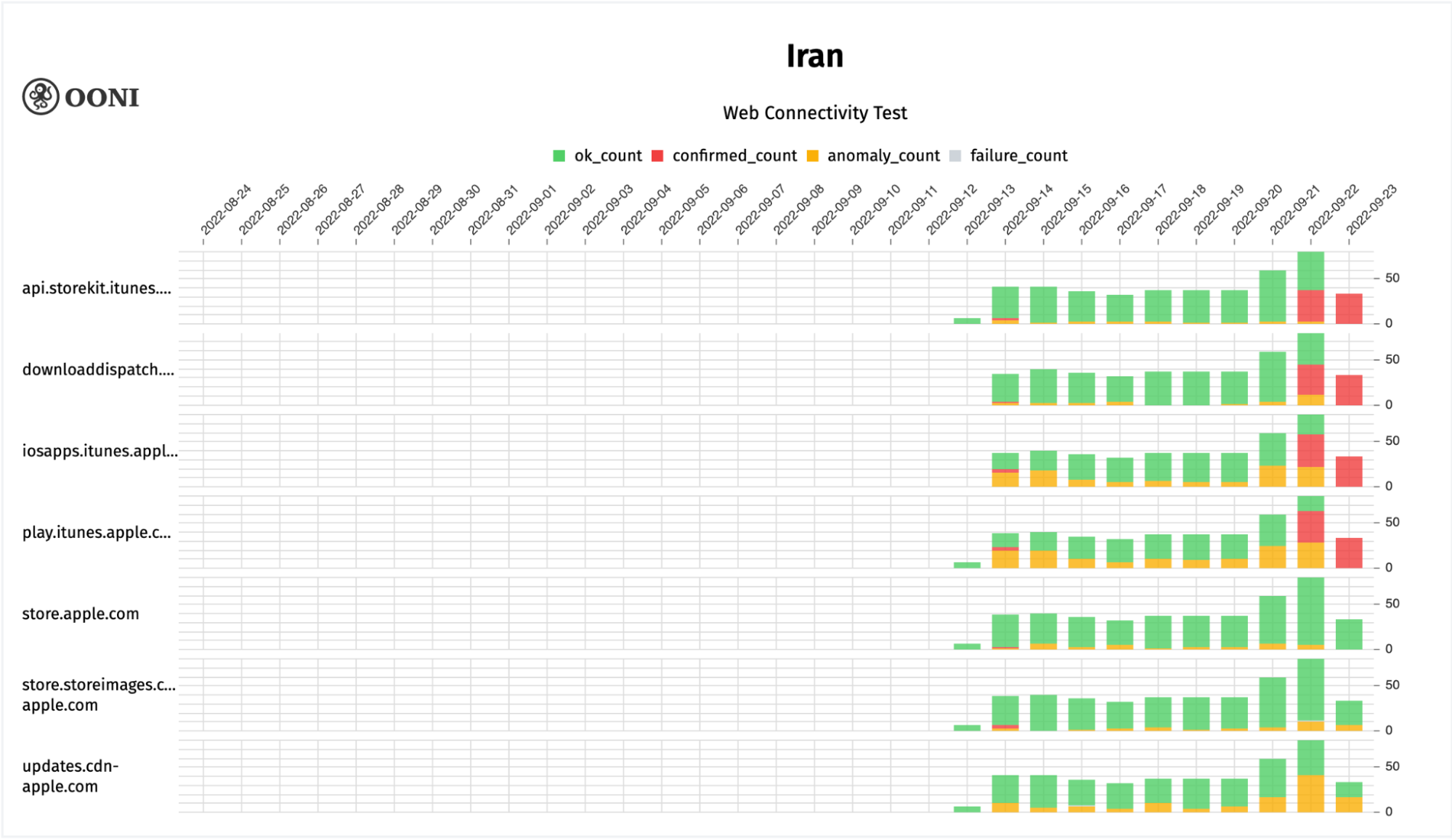 Chart: OONI data on the testing of domains related to Apple’s app store in Iran between August 2022 to September 2022 (source: OONI MAT).