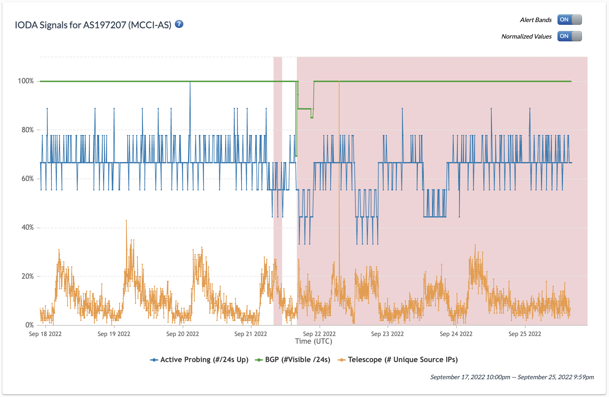 Chart: Internet Outage Detection and Analysis (IODA) signals for MCCI (AS197207) between 18th September 2022 to 25th September 2022 (source: IODA).