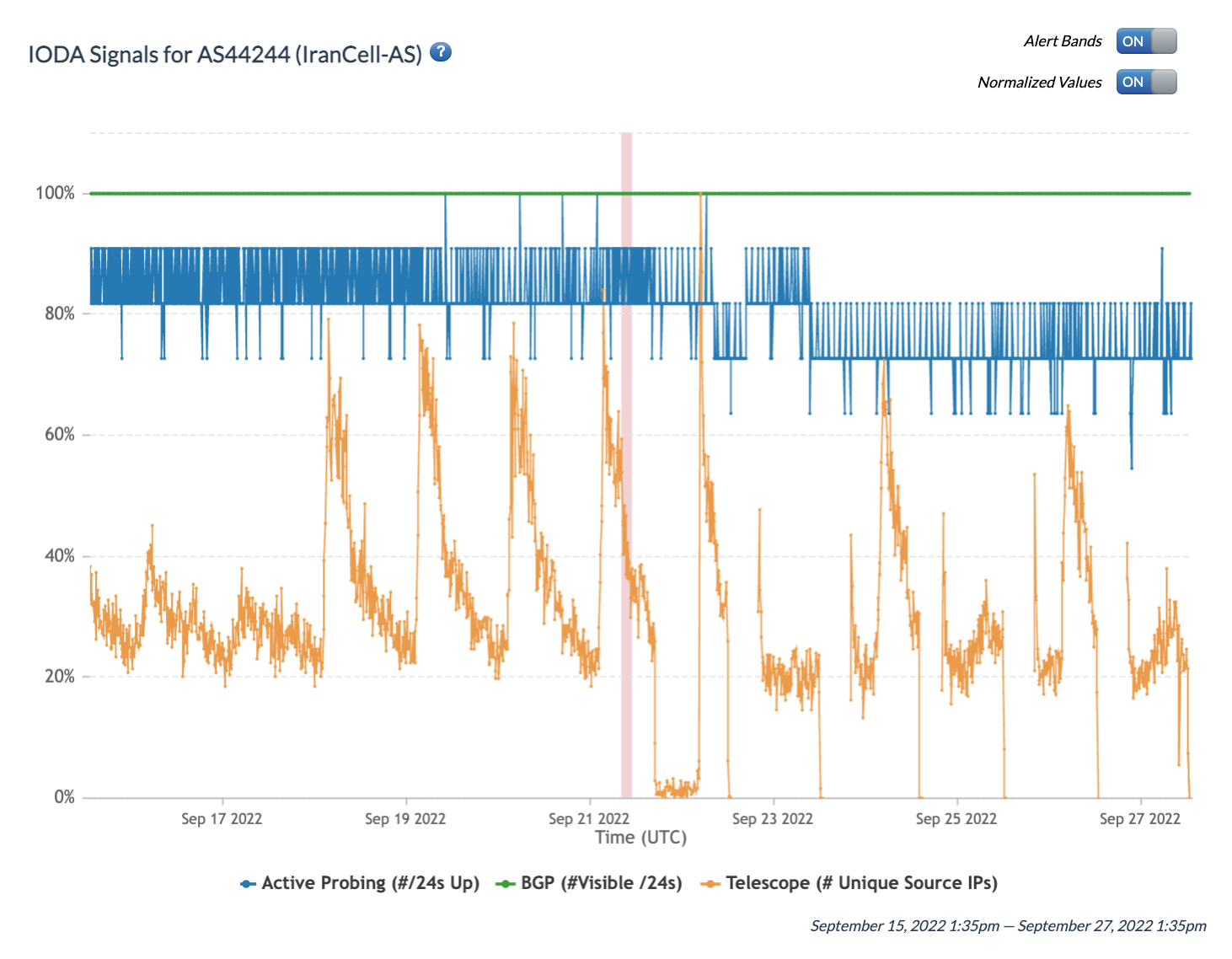 Chart: Internet Outage Detection and Analysis (IODA) signals for IranCell (AS44244) between 16th September 2022 to 27th September 2022 (source: IODA).