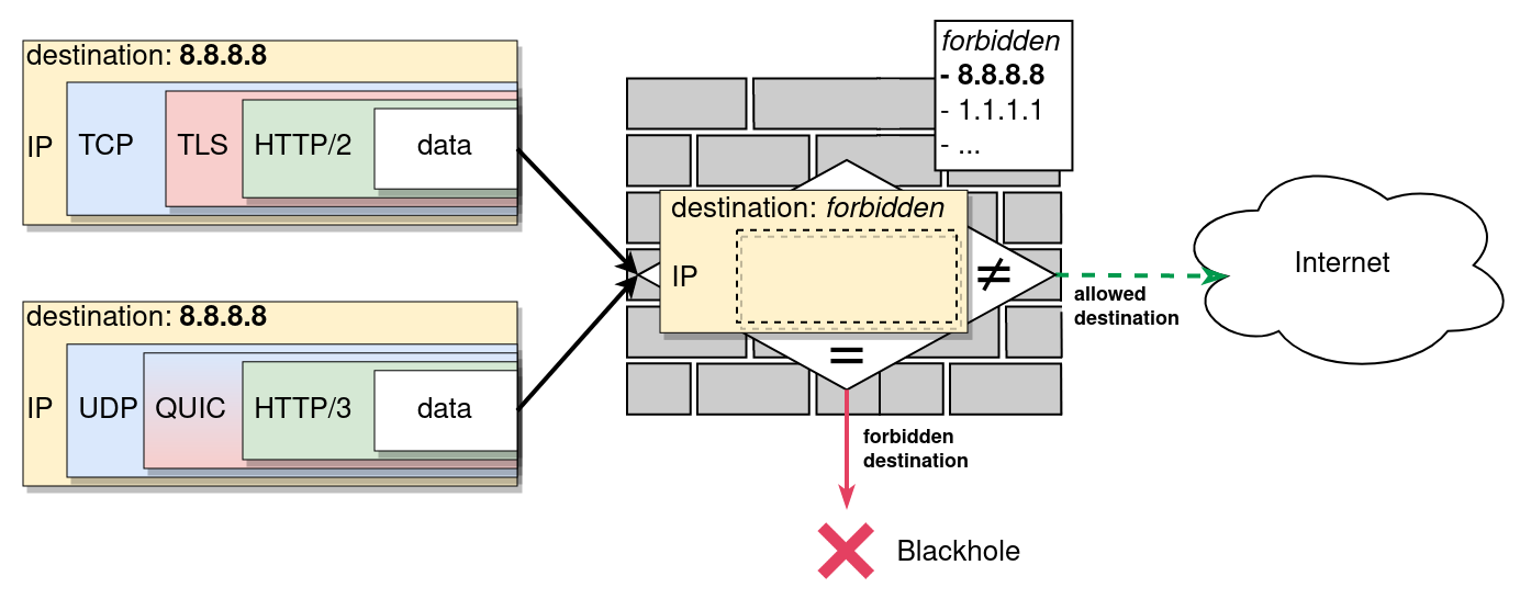 Exemplified depiction of how IP censorship affects both HTTPS and HTTP/3: Such firewalls inspect only the IP header and block every packet with a blacklisted destination (or source) address.It may seem surprising that the Great Firewall, which is known to apply very restrictive and rather sophisticated blocking, does not explicitly block HTTP/3 yet. But there are a few considerations to keep in mind: